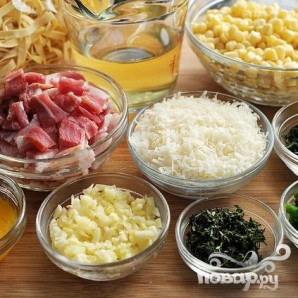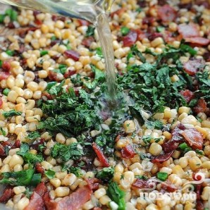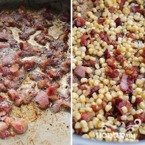 2. Нарезать бекон кубиками. Обжарить в сковороде на сильном огне до коричневого цвета. Добавить сладкую кукурузу и обжарить края.