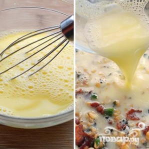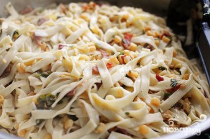 4. В небольшой миске взбить яичные желтки. Медленно добавить в макаронную жидкость и перемешать, чтобы растворить их. Добавить пасту и яичные желтки в кукурузную смесь в сковороде и перемешать.