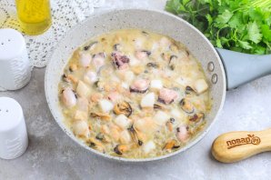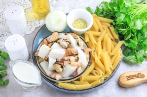 Блюдо готовится без лишних сложностей. Морепродукты для приготовления блюда можно приобрести по отдельности, а можно в виде морского коктейля. Он доступен в супермаркетах в замороженном виде, поэтому не забудьте его разморозить заранее, минимум за полчаса до начала приготовления Готовое блюдо можно подавать к столу.
