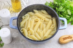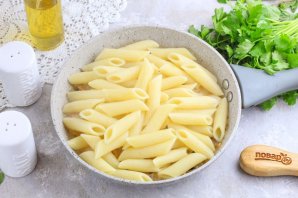 Вскипятите воду в казане или кастрюле и всыпьте в нее соль, а затем пасту. Отварите ее примерно 8-12 минут. Время варки макаронных изделий точно указано на упаковке с ними.