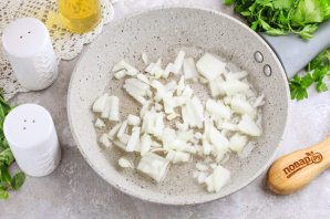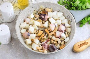 Очистите луковицу от кожуры и промойте в воде. Нарежьте мелкими кубиками и отпассеруйте в растительном масле на сковороде примерно 5-6 минут до румяности. Обязательно сначала обжаривайте лук, а потом — морепродукты. Иначе они выпустят жидкость и лук пропарится, а не прожарится!