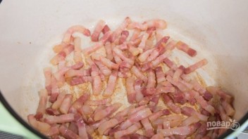 1. Порежьте панчетту небольшими продолговатыми кусочками и положите в заранее нагретую на среднем огне толстостенную кастрюлю. Как только панчетта начнет плавится и выделять жир, увеличьте огонь и обжарьте ее до коричневого цвета.