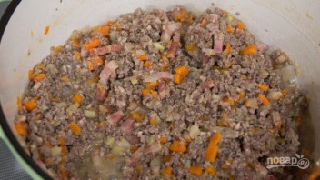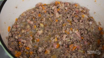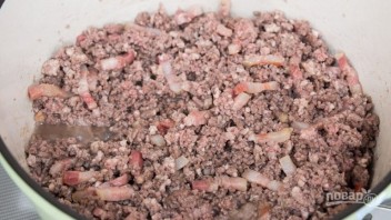 2. Добавьте в кастрюлю свиной и говяжий фарш, и поджарьте, перемешивая лопаткой. Переложите мясо в другую емкость, как можно больше оставив жира на сковороде.