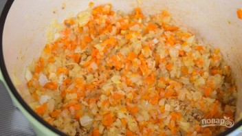3. Промойте, очистите и мелко нарежьте сельдерей, морковь и лук. Положите эти ингредиенты в кастрюлю, накройте крышкой, сделайте низкий огонь и готовьте в течение 10 минут. Затем снимите крышку, увеличьте огонь и готовьте еще 10 минут, пока не испарится вся вода с овощей и они не потемнеют.