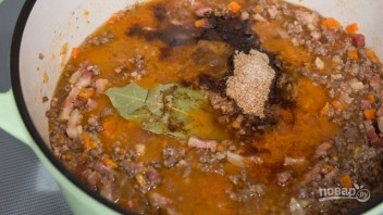6. Измельчите мускатный орех. Добавьте в кастрюлю томатный сок, мускатный орех, лавровый лист, черный перец, грибную приправу и все перемешайте. Накройте кастрюлю крышкой и уменьшите огонь до минимума. Так готовьте в течение 1,5-2 часов, периодически помешивая, чтобы исключить пригорание. Если соус станет слишком густой, то добавьте немного воды.