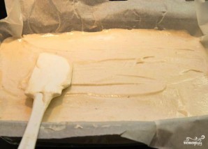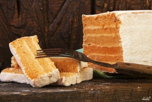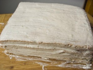 Через 6 часов достаем противень. Разрезаем пласт на 4 части. Смазываем их отложенным взбитым белком. Накладываем пласты друг на друга. Подсушиваем 3-4 часа.
