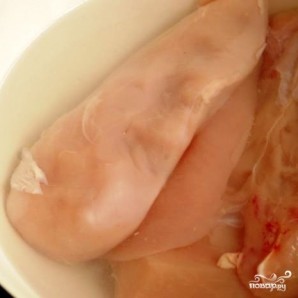 Куриную грудку замачиваем на ночь в соленой воде.