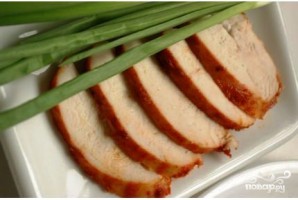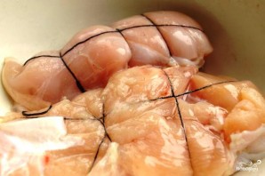 На следующий день воду сливаем, а куриное филе туго связываем нитками (как на фото). Это делается для того, чтобы мясо не потеряло нужную нам форму.