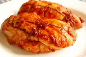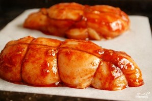 Получившимся маринадом равномерно смазываем обвязанное куриное филе.