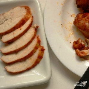 Ждем, пока мясо остынет, после чего удаляем нитки, а само мясо нарезаем ломтиками.
