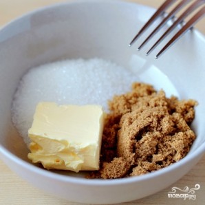 В порционной тарелке смешиваем сахар и масло. Вилкой перемешиваем эти ингредиенты.