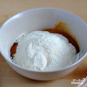 Добавляем муку, соль и соду. Еще раз хорошенько перемешиваем.