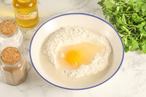 Всыпьте 1 стакан муки в глубокую емкость и сделайте в муке лунку. Вбейте туда куриное яйцо, всыпьте соль и влейте воду. Аккуратно все перемешайте.