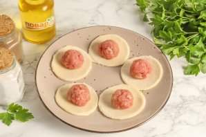 Разделите тесто на равные части. Раскатайте их по очереди не сильно тонко и вырежьте кружочки из теста с помощью чашки. Не забывайте обмакивать чашку в муку, чтобы тесто не прилипало к ней. Скатайте из фарша колобки и выложите их на кружочки теста.