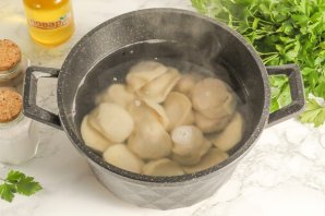 Вскипятите воду в кастрюле или казане, всыпьте соль и добавьте в кипяток пельмени по одному. Перемешайте и отварите после всплытия примерно 10-12 минут.