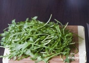 1. Прежде всего начинайте с приготовления начинки для пирога. Рукколу хорошенько промойте и просушите. Порежьте салат.