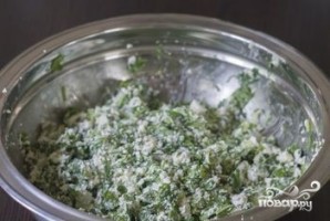 4. Возьмите емкость, высыпьте в нее щавель, зелень и рукколу. Помешайте все ингредиенты (можно руками). Брынзу придется покрошить, добавив немного зелени.