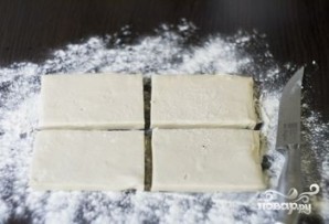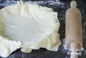 7. Стол присыпьте мукой. Возьмите тесто, разделите его на четыре части. Каждую из частей раскатывайте как можно тоньше. Лист должен быть больше диаметра формы, за счет этого можно будет подвернуть края пирога.