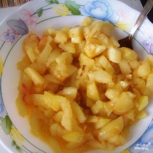 Тем временем яблоки чистим, нарезаем некрупным кубиком, обжарить на среднем огне в растительном масле в течение 2 минут, после чего присыпаем небольшим количеством сахара (по вкусу, в зависимости от того, насколько кислые у вас яблоки) и перемешиваем.