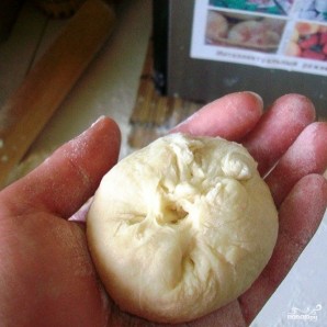 Отщипываем небольшой кусочек теста, раскатываем в лепешку. В центр лепешки кладем немного начинки.