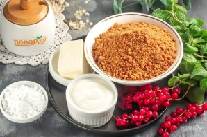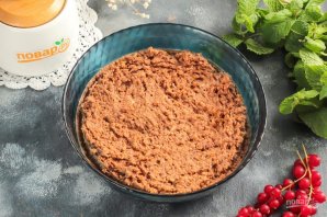 Подготовьте указанные ингредиенты. Лучше всего измельчить в крошку медовый корж или медовое печенье с помощью блендера. В качестве обсыпки можно использовать какао-порошок или кокосовую стружку, медовую крошку, это по вашему желанию.