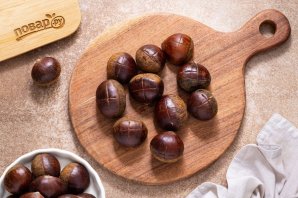 Каштаны помойте, затем острым ножом надрежьте скорлупу крест-накрест.