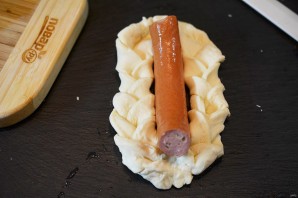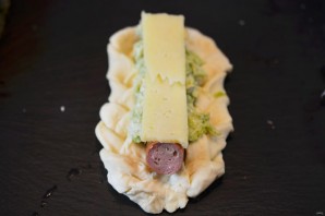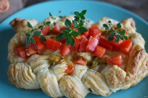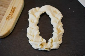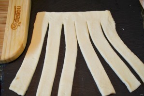 Из указанных ингредиентов замесить тесто или взять готовое слоёное. Из теста сделать квадрат и разрезать не до конца на 6 полосок.