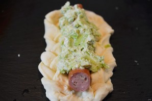 Закуска готовится быстро и просто. Такой плетеный хот-дог можно сделать и из готового теста, например, слоёного. Здесь главное то, что он получается очень красивый и яркий за счет гуакамоле и томатной сальсы. Ну и, конечно, вкусный за счет сосиски, нежного сыра и гуакамоле Подавайте закуску к столу.