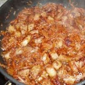 Когда лук приобретет золотой оттенок, добавьте мясо и жарьте, часто перемешивая.