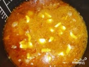 Переложите мясо с овощами в чашу мультиварки, туда же добавьте чеснок, еще немного соли, перца и зиры. Залейте все горячей кипяченой водой так. Вода должна покрывать продукты на 1-2 см. Закройте крышку и выберите режим "Суп" или "Тушение". Готовьте в течение 40 минут.