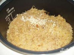Когда вы услышите звуковой сигнал, означающий завершение программы, откройте крышку. Мелко нашинкуйте оставшуюся половину чеснока и добавьте в мультиварку. Также добавьте немного молотой зиры. Тщательно перемешайте плов, выключите мультиварку. Оставьте плов настаиваться под закрытой крышкой на 10-15 минут.