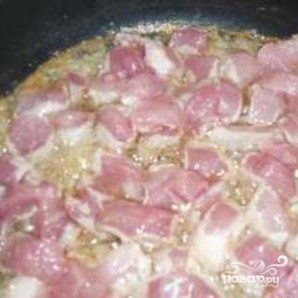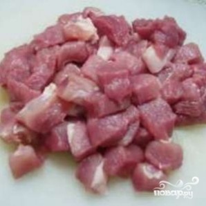 Мясо также нарежьте кубиками (сторона кубика - примерно 2 см).