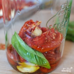 Наполняем баночку сушеными помидорами, чесноком, свежим базиликом.