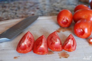 Затем каждый помидор разрезаем на 4 части.