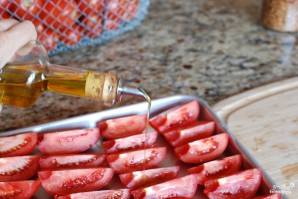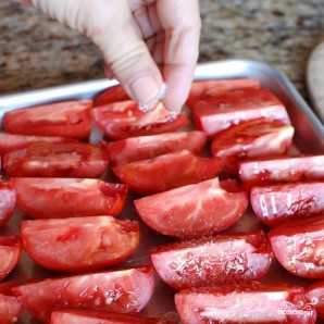Выкладываем четвертинки помидоров на противень, слегка смазанный оливковым маслом.