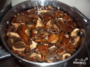 Замоченные сушеные грибы вместе с водой перекладываем в кастрюлю и добавляем еще 1.5 литра холодной воды. Доводим до кипения и оставляем вариться на 30 минут.