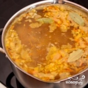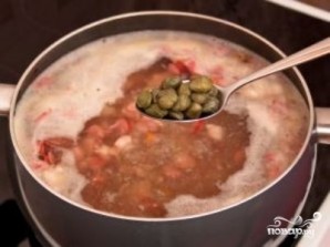 В это же время кладем свежие шампиньоны, каперсы и лавровый лист в кипящий грибной бульон.