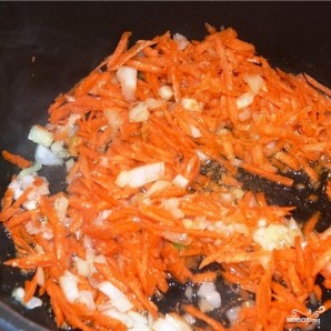 Разогреть в сковороде немного масла, обжарить лук с морковью на среднем огне до мягкости (6-7 минут помешивая).