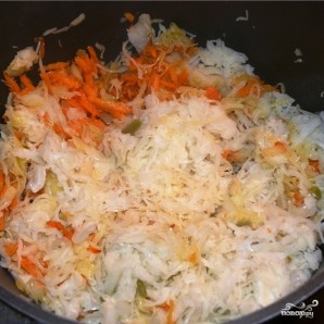 Добавить капусту, перемешать и тушить под крышкой на среднем огне, иногда помешивая, в течение 1 часа.