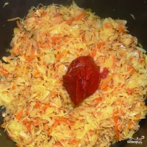 В конце тушения капусты добавляем в сковороду томат, перемешиваем и тушим вместе еще 5-10 минут.