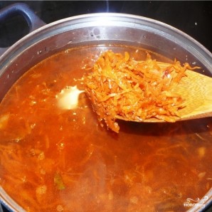 Затем в кастрюлю с грибным бульоном необходимо добавить все содержимое сковороды, а также лавровый лист, перец и соль. Варим еще 10-15 минут на среднем огне.