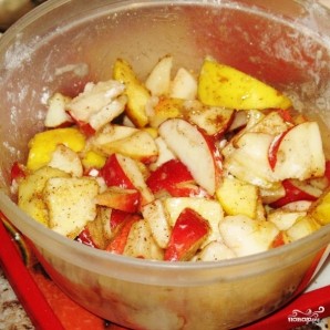 Смешиваем в миске яблоки, крахмал, корицу, сахарную пудру и немножко (столовую ложку) муки. Хорошенько перемешиваем.