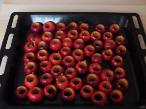 Ранетки вымойте и удалите семенную коробочку. Разложите их на противень, добавьте 0,25 стакана воды и поставьте в горячую (200 градусов) духовку на 20 минут. Периодически посматривайте, возможно необходимо будет подлить воды. Не допускайте подгорания ранеток!