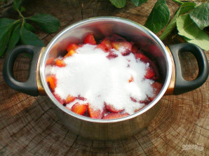 Насыпаем сахар и ставим кастрюлю на минимальный огонь.
