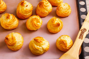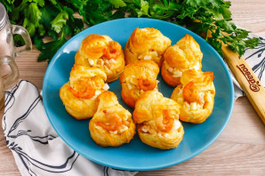 Идеально подойдёт к чаю и кофе. Чтобы профитроли не осели после извлечения из духовки, обязательно добавляйте в тесто разрыхлитель. Если у вас много креветок, то вы можете сделать начинку только из них, добавляя какой-нибудь соус либо свежую зелень для сочности Выпечка готова. Подавайте к столу.