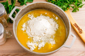Всыпьте в жидкость пшеничную муку с разрыхлителем, начните перемешивать, заваривая тесто.
