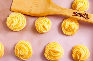 Отсадите его небольшими порциями на силиконовый коврик или пергаментную бумагу, стараясь это делать на расстоянии друг от друга, так как профитроли вырастут. Кстати, выпекая их на пергаментной бумаге, нужно дождаться полного остывания выпечки, иначе вы не сможете ее снять!