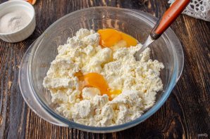 В подходящую миску выложите творог, добавьте сахар и соль. Разотрите массу вилкой до однородности.