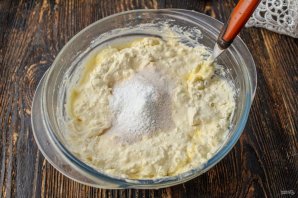 Добавьте рисовую муку, разрыхлитель и ванилин. Творожную массу хорошо перемешайте.