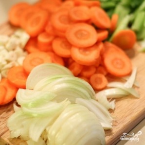 Нарежем наши овощи, как на фото: сельдерей - ломтиками, морковь - кружочками, лук - полукольцами, чеснок - тонкими дольками.